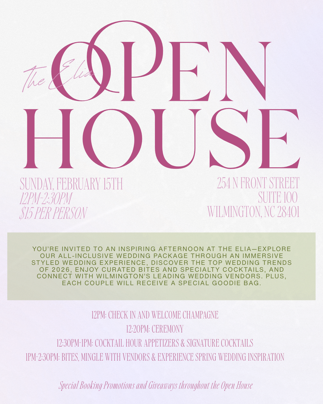 Your ticket allows entry for one individual and includes: appetizers, signature cocktails, and access to some of Wilmington’s premier wedding vendors. Plus each couple will receive a special goodie bag.